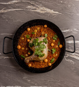 Calasparra rice, traditional sofrito, sous-vide chicken, criolla salsa, and aji limo aioli.